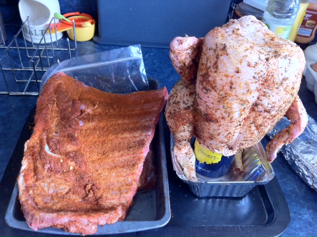Well here are the ribs and chicken ready to go. One ribs was marinaded for almost 24hrs the other dry rubbed just before lighting the charcoal. Chicken was lightly oiled and seasoned and I used 1/2 can of pear cider with extra holes around the top. The other half of the cider I used to soak the oak chips.