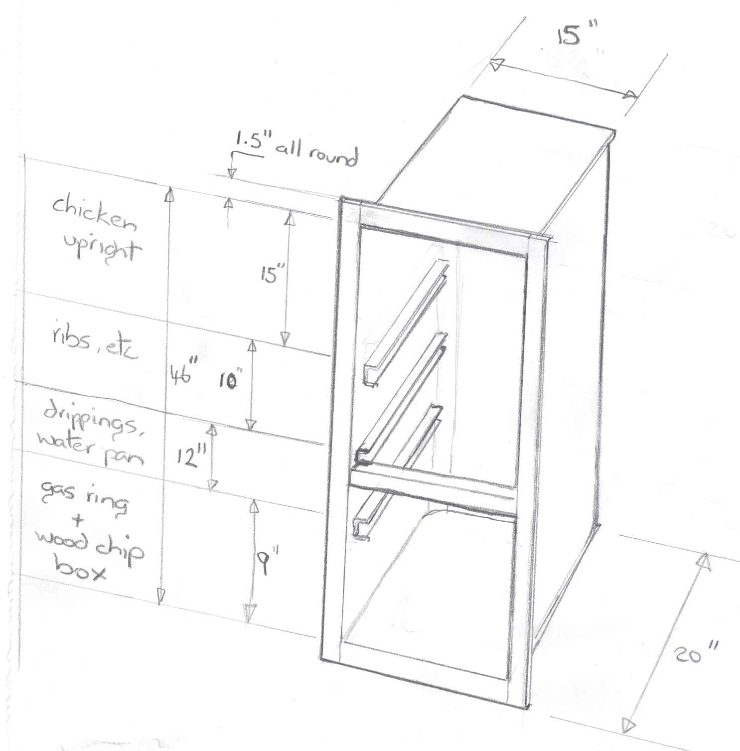 On another thread a member mentioned that chicken takes on smoke quickly. As I'm in the process of getting my vertical/filecabinet smoker made I'd like some opinions on where to stack my foods. I was planning on cooking different foods together, I've done a drawing which I thought would work, it'll give you an idea on what I plan to do. This is the inner for the filecabinet.